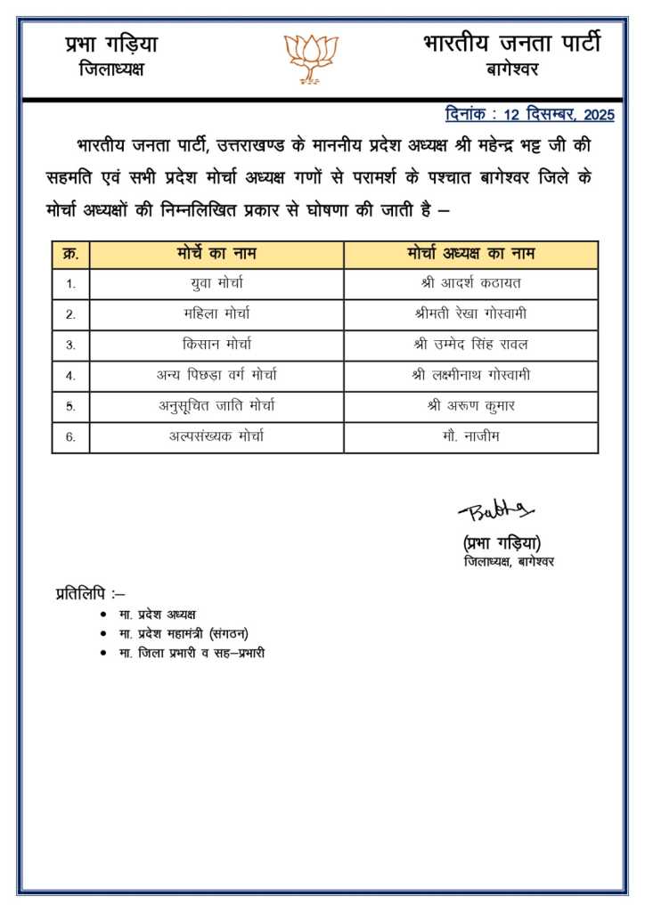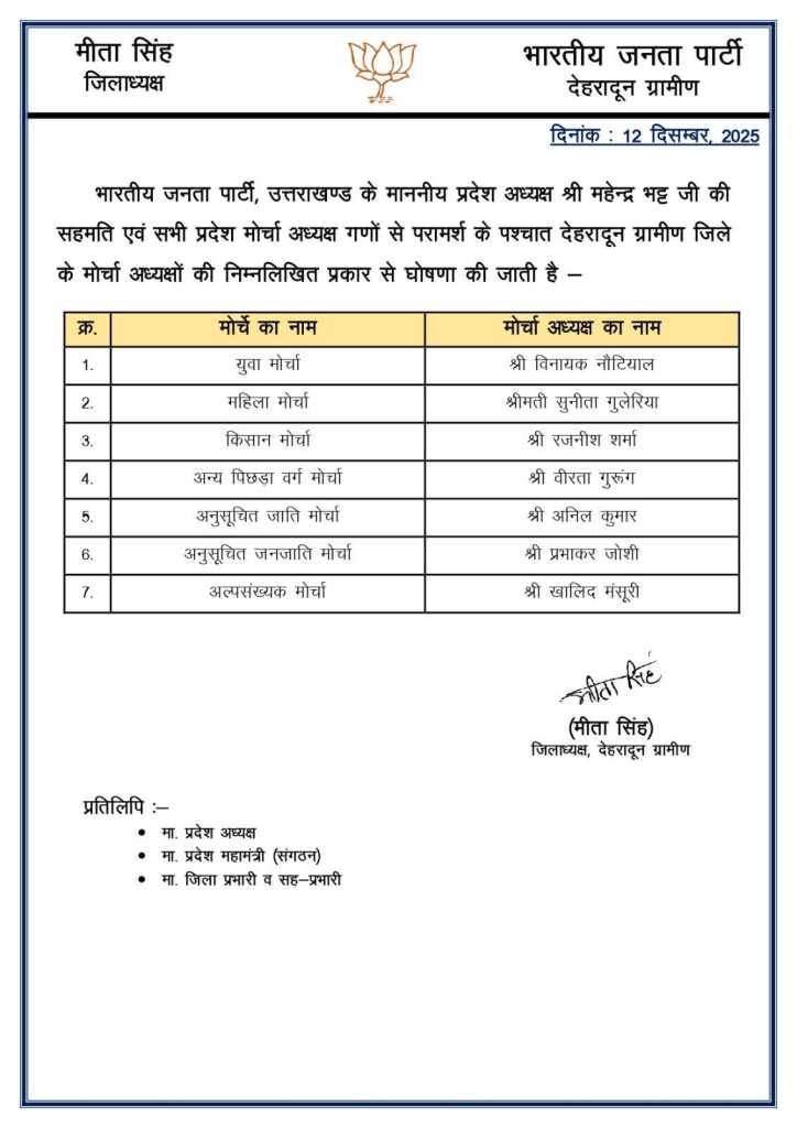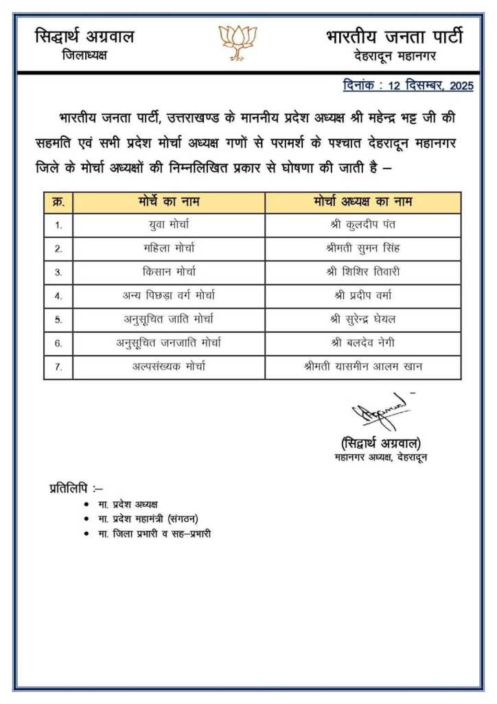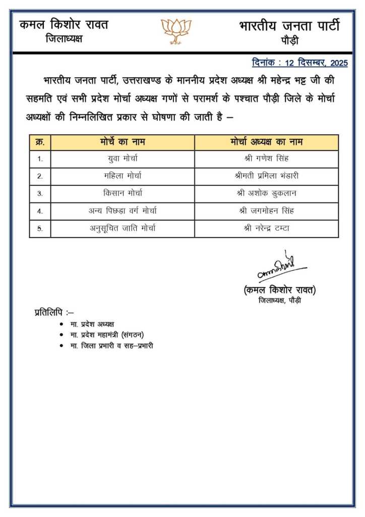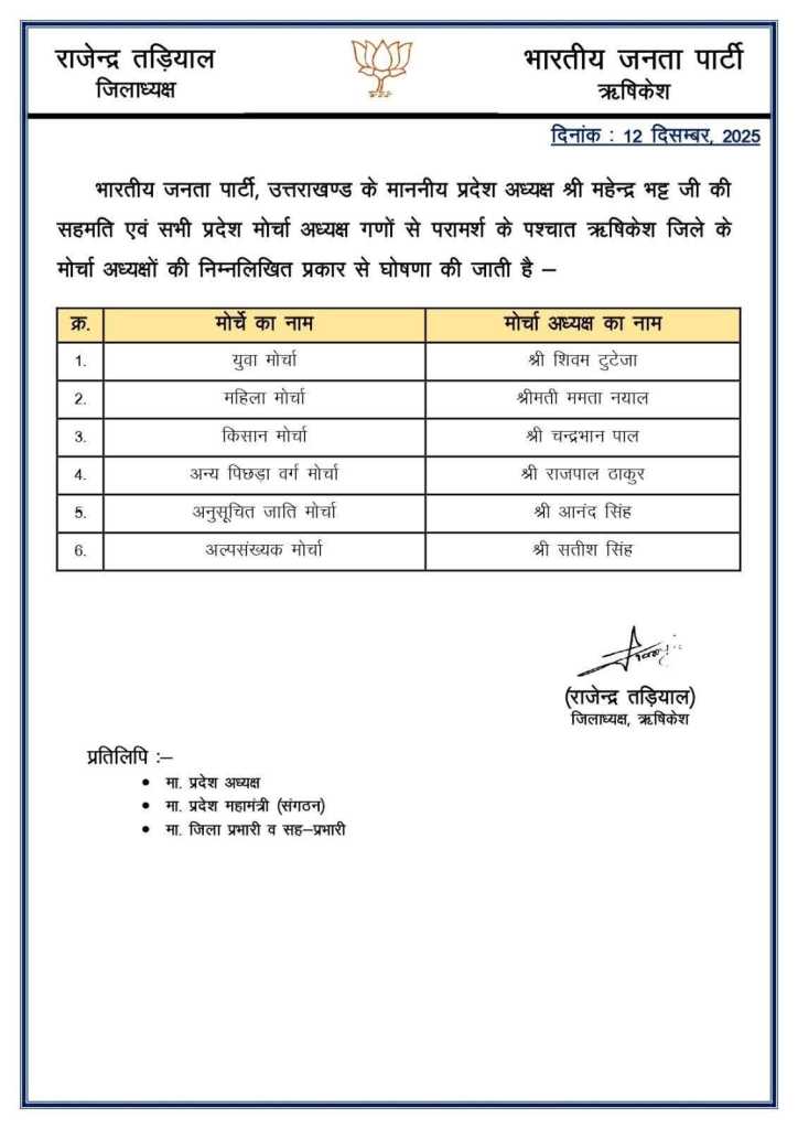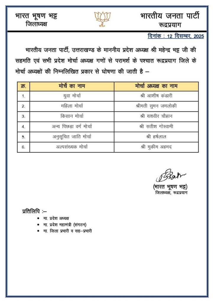 उत्तराखंड में भारतीय जनता पार्टी (BJP) ने संगठनात्मक स्तर पर अहम निर्णय लेते हुए जिलों के मोर्चा अध्यक्षों की घोषणा कर दी है। यह निर्णय प्रदेश अध्यक्ष महेंद्र भट्ट की सहमति से और सभी प्रदेश मोर्चा अध्यक्षों से व्यापक परामर्श के बाद लिया गया।