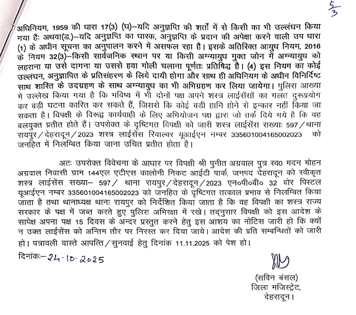 उक्त घटना पर वरिष्ठ पुलिस अधीक्षक देहरादून द्वारा प्रस्तुत रिपोर्ट में उल्लेख किया गया कि थाना प्रभारी रायपुर, देहरादून के माध्यम से उ०नि० चौकी प्रभारी मयूर विहार थाना रायपुर देहरादून ने अपनी आख्या 24.10.2025 के द्वारा अवगत कराया है कि 19.10.2025 को थाना रायपुर क्षेत्रान्तर्गत एटीएस कालोनी में दो पक्षों में पटाखा जलाने को लेकर विवाद हो गया था। शान्ति एवं कानून व्यवस्था के दृष्टिगत दोनों पक्षों का धारा 126/135 बीएनएसएस के अन्तर्गत चालान मा० न्यायालय को प्रेषित किया गया है। उक्त घटना के दौरान पुनीत अग्रवाल पुत्र मदन मोहन अग्रवाल निवासी 144 एल एटीएस कालोनी निकट आईटी पार्क जनपद देहरादून द्वारा मामूली विवाद के दौरान अपने लाईसेंसी शस्त्र को प्रदर्शित किया गया। मामूली विवाद के दौरान इस प्रकार लाईसेंसी शस्त्र को प्रदर्शित करना उक्त शस्त्र लाईसेंस घारक पुनीत अग्रवाल का लापरवाही पूर्ण कृत्य है जिस पर उनका शस्त्र जब्त करते हुए लाईसेंस धारक का शस्त्र लाईसेंस निलिम्बत कर दिया गया है। वरिष्ठ पुलिस अधीक्षक, देहरादून द्वारा प्रकरण की गम्भीरता के दृष्टिगत लाईसेंस धारक पुनीत अग्रवाल पुत्र मदन मोहन अग्रवाल निवासी 144एल एटीएस कालोनी का शस्त्र लाईसेंस संख्या-597/थाना रायपुर यूआईएन नं0-335601004165002023 को निरस्त करने का अनुरोध किया गया, जिस पर जिलाधिकारी ने लाईसेंस निलम्बित करते हुए शस्त्र जब्त करवा दिया है। तथा लाइसेंस निरस्तीकरण की कार्रवाई प्रारंभ कर दी गई है