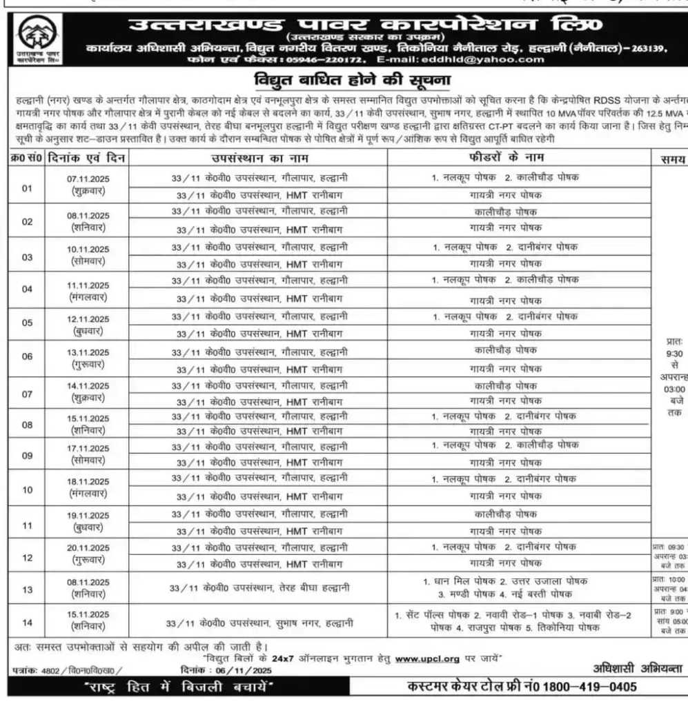 हल्द्वानी – नगर खंड के तहत गौला पार, काठगोदाम और बनभूलपुरा क्षेत्रों के सभी सम्मानित विद्युत उपभोक्ताओं को सूचित किया जाता है कि केन्द्र पोषित RDSS योजना के अंतर्गत विद्युत आपूर्ति में कुछ कार्य किए जाने हैं।
