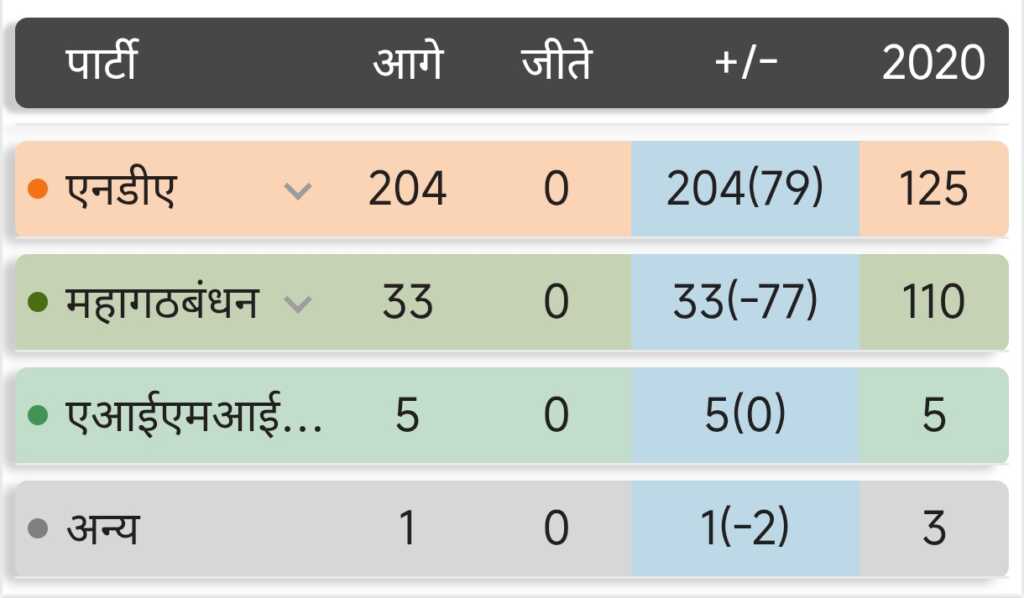 पटना। बिहार विधानसभा चुनाव में आज हुई मतगणना के बाद जो स्थिति सामने बन रही है, उससे स्पष्ट होता है कि बिहार की विधानसभा चुनाव में जनता ने एक मजबूत संदेश दिया है। जदयू-भाजपा की अगुवाई वाली एनडीए महागठबंधन को बड़े अंतर से मात देती दिख रही है। शुरुआती दौर में ही एनडीए ने आकड़ों में स्पष्ट बढ़त बना ली है। इससे विपक्षी गठबंधन की उम्मीदों को बड़ा झटका लगा है। 01 बजे तक के रुझानों में एनडीए 198 सीटों पर बढ़त बनाए हुए है। वहीं, राजद की अगुवाई में महागठबंधन के प्रत्याशी केवल 39 सीटों पर ही आगे चल रहे हैं। अन्य उम्मीदवार तीन सीटों पर आगे हैं। बिहार चुनाव नतीजों के रुझानों में सबसे अधिक चौंकाया है जनसुराज ने। प्रशांत किशोर की पार्टी के उम्मीदवार किसी भी सीट पर बढ़त नहीं बना सके हैं।