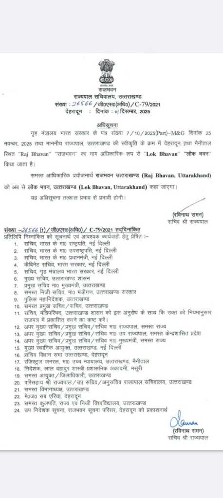 देहरादून और नैनीताल में स्थित राजभवन अब ‘लोक भवन’ के नाम से जाना जाएगा। इस संबंध में राज्यपाल सचिव रविनाथ रामन ने सोमवार को आदेश जारी कर दिए हैं