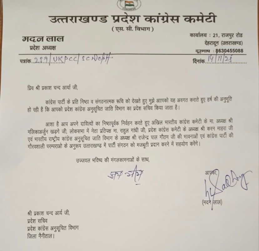 बेतालघाट घिरोली निवासी प्रकाश चंद्र आर्य को मिली कांग्रेस scमैं प्रदेश सचिव की ज़िम्मेदारी ।क्षेत्र में खुशी की लहर ।शीघ्र ही नैनीताल में होगा सम्मान समारोह ।इस आशय की जानकारी देते हुए जिला अध्यक्ष ईन्दरपाल आर्य ने बताया कि प्रकाश चन्द्र ने कांग्रेस मैं लम्बे समय से कांग्रेस को मजबूत करने का काम किया है । मदन लाल ने नेता प्रतिपक्ष यशपाल आर्य पूर्व मुख्यमंत्री हरीश रावत प्रदेश कांग्रेस कमेटी अध्यक्ष गणेश गोदियाल व पूर्व कांग्रेस ज़िलाध्यक्ष सतीश नैनवाल की शिफारिश पर एस सी विभाग में प्रदेश सचिव पद नियुक्त होने पर हार्दिक-हार्दिक शुभकामनाएं एवं बधाई प्रेषित की गयी है ।बहुत लंबे समय से कांग्रेस पार्टी के साथ उनका बहुत ही अनुभव रहा है पूर्व में जिला अध्यक्ष रहे प्रदेश सचिव रहे फिर से प्रदेश सचिव बनाए जाने पर बहुत-बहुत बधाई हार्दिक शुभकामनाएं हमें आशा है कि कांग्रेस पार्टी को और ज्यादा मजबूती देने में उनका योगदान रहेगाप्रकाश चन्द्र आर्य के मनोनीत होने पर महामंत्री ईश्वरी लाल,कैलाश चंद्र ,बालकृष्ण ,महेंद्र कुमार प्रेम चंद केशव कुमार हरीश चंद्र ठाकुर सिंह राजेन्द्र सिंह मोहित पंत इन्द्र सिंह बोहरा माया बोहरा चम्पा बोहरा आनंद राम विजय कुमार एस लाल नवीन चंद्र आदि ने बधाई प्रेषित की है ।