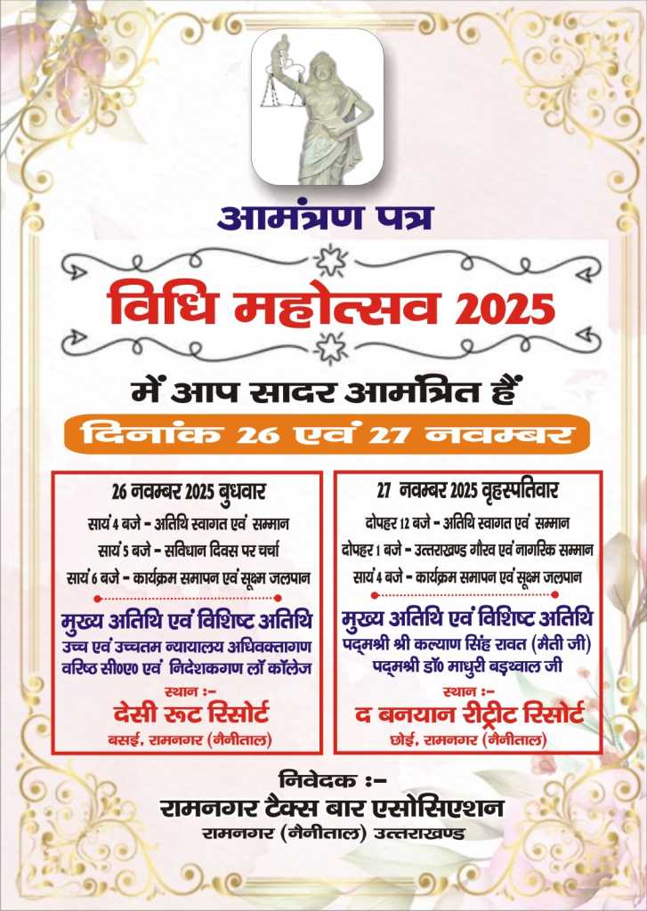 टैक्स बार एसोसिएशन द्वारा आयोजित दो दिवसीय “विधि महोत्सव” का आयोजन आगामी 26 एवं 27 नवंबर को किया जाएगा। यह महोत्सव विधि क्षेत्र, संवैधानिक मूल्यों तथा समाज में न्यायिक जागरूकता को बढ़ावा देने के उद्देश्य से आयोजित किया जा रहा है।