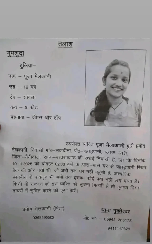 भीमताल : पूजा मेलाकानी पुत्री प्रमोद मेलकानी, निवासी गांव-सकदीना, पो०-पहाड़पानी, ब्लाक-धारी, जिला-नैनीताल, राज्य-उत्तराखण्ड की स्थाई निवासी है, जो कि दिनांक 10.11.2025 को दोपहर 02:00 बजे के आस-पास घर से पहाड़पानी स्थित बैंक की ओर गयी थी. जो अभी तक घर नहीं पहुंची है, अत्यधिक छानबीन के बावजूद भी अभी तक इसका कोई पता नही लग पाया है। किसी भी सज्जन को इस ब्यक्ति की सूचना मिलती है तो कृपया निम्न नम्बरों में सूचित करने की कृपा करें।